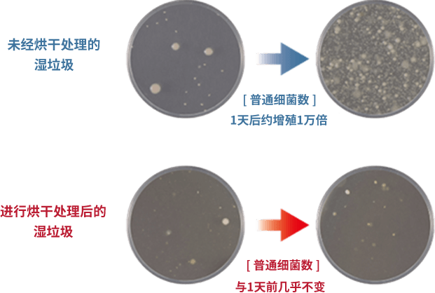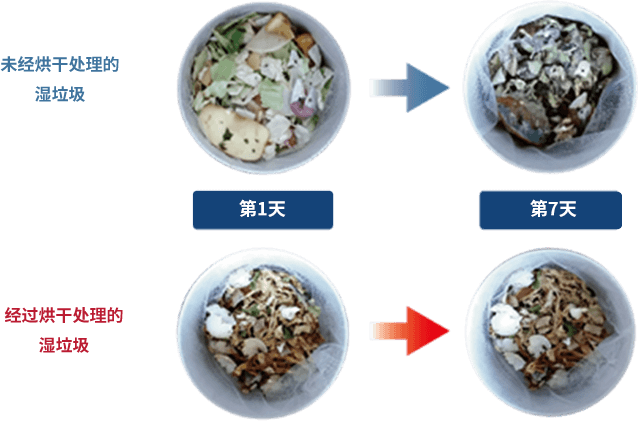 使用低功率的加热器,用60℃~80℃左右的低温风进行干燥。因为湿垃圾大约80%都是水分,所以干燥过后的湿垃圾体积可以减量至1/5。 |